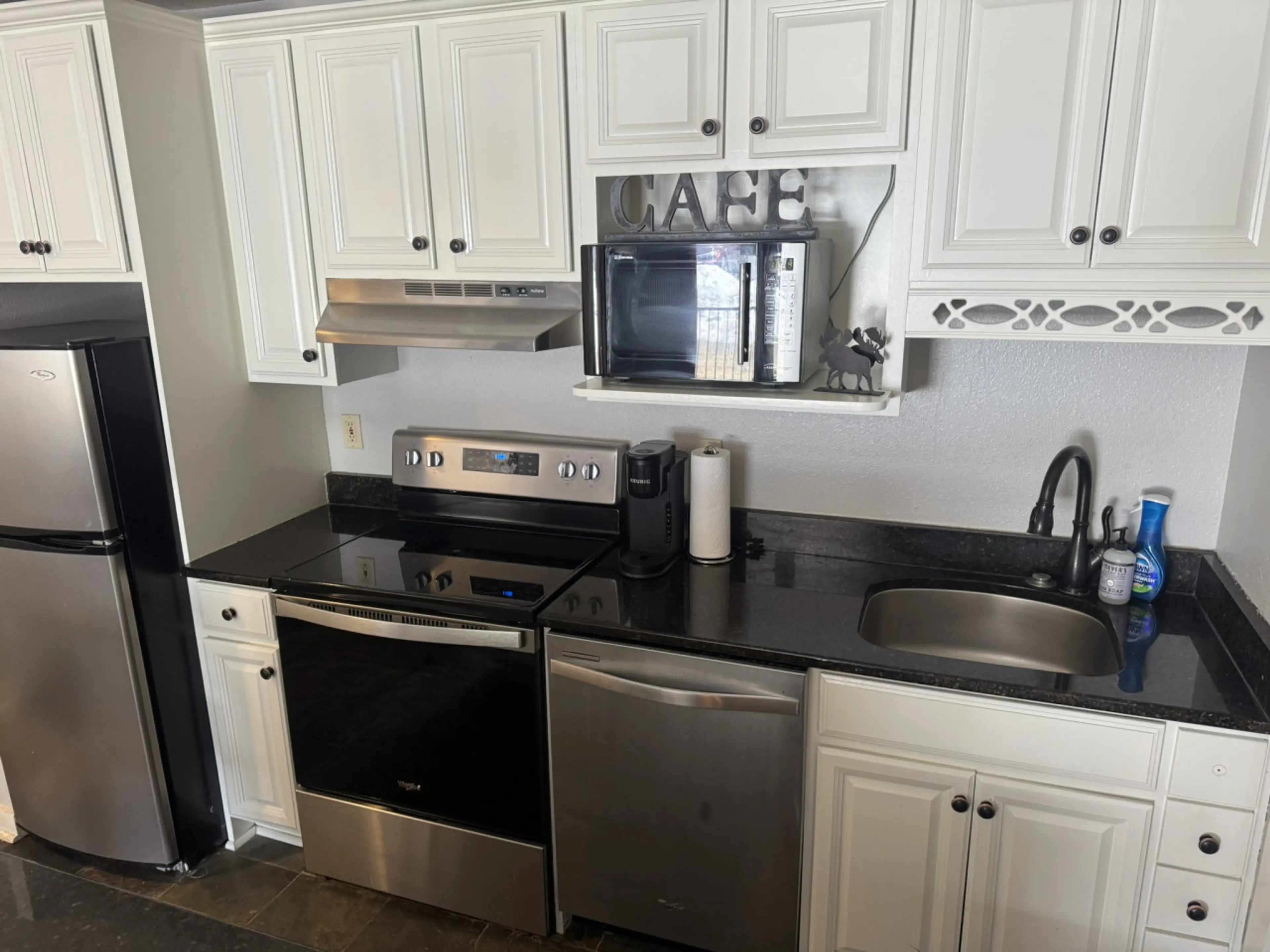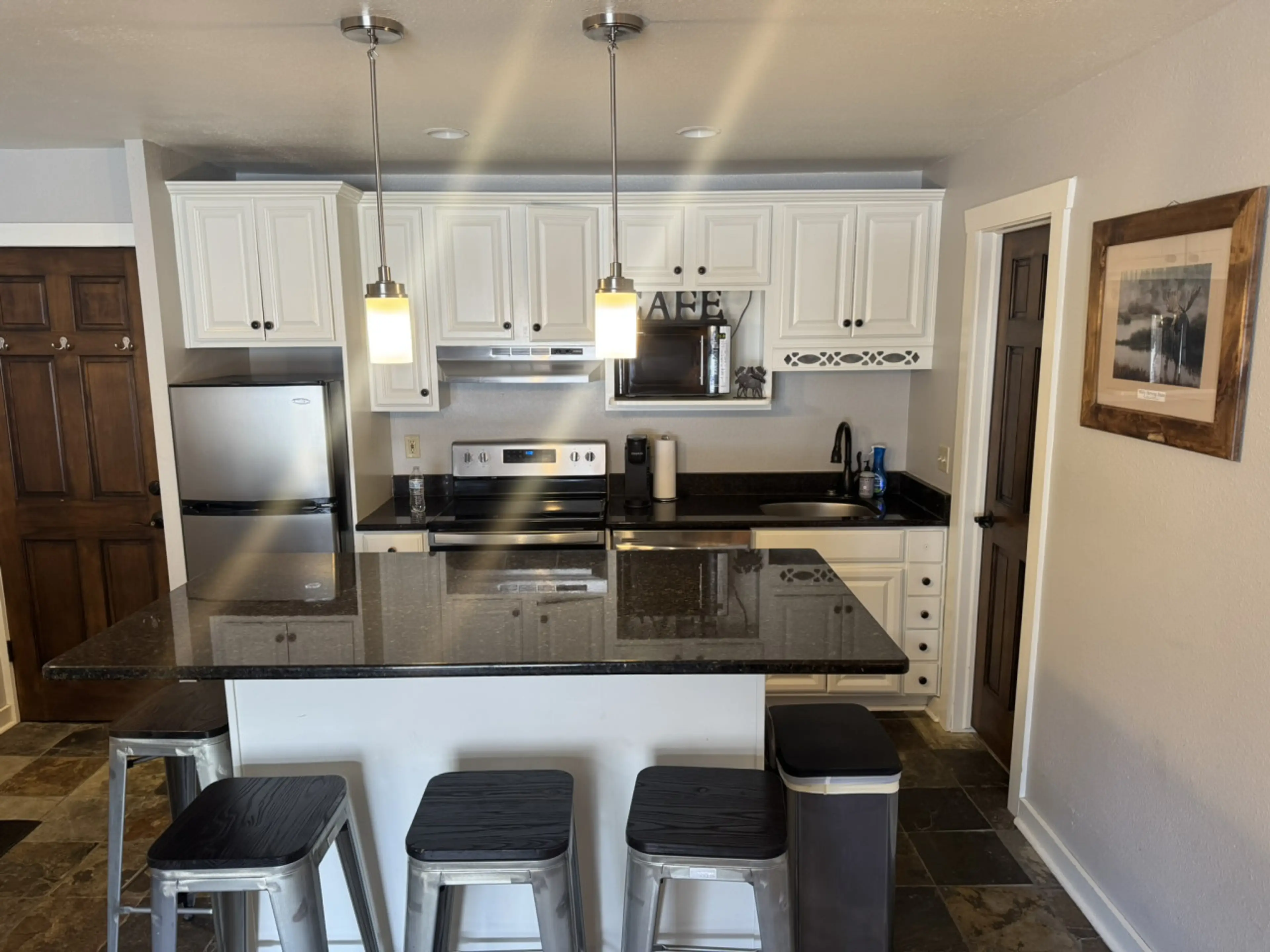 Check in process was smooth & location was great. Stainless steel appliances & granite counters in the kitchen. Bathroom was a bit dated. Overall a very clean condo & would stay again.